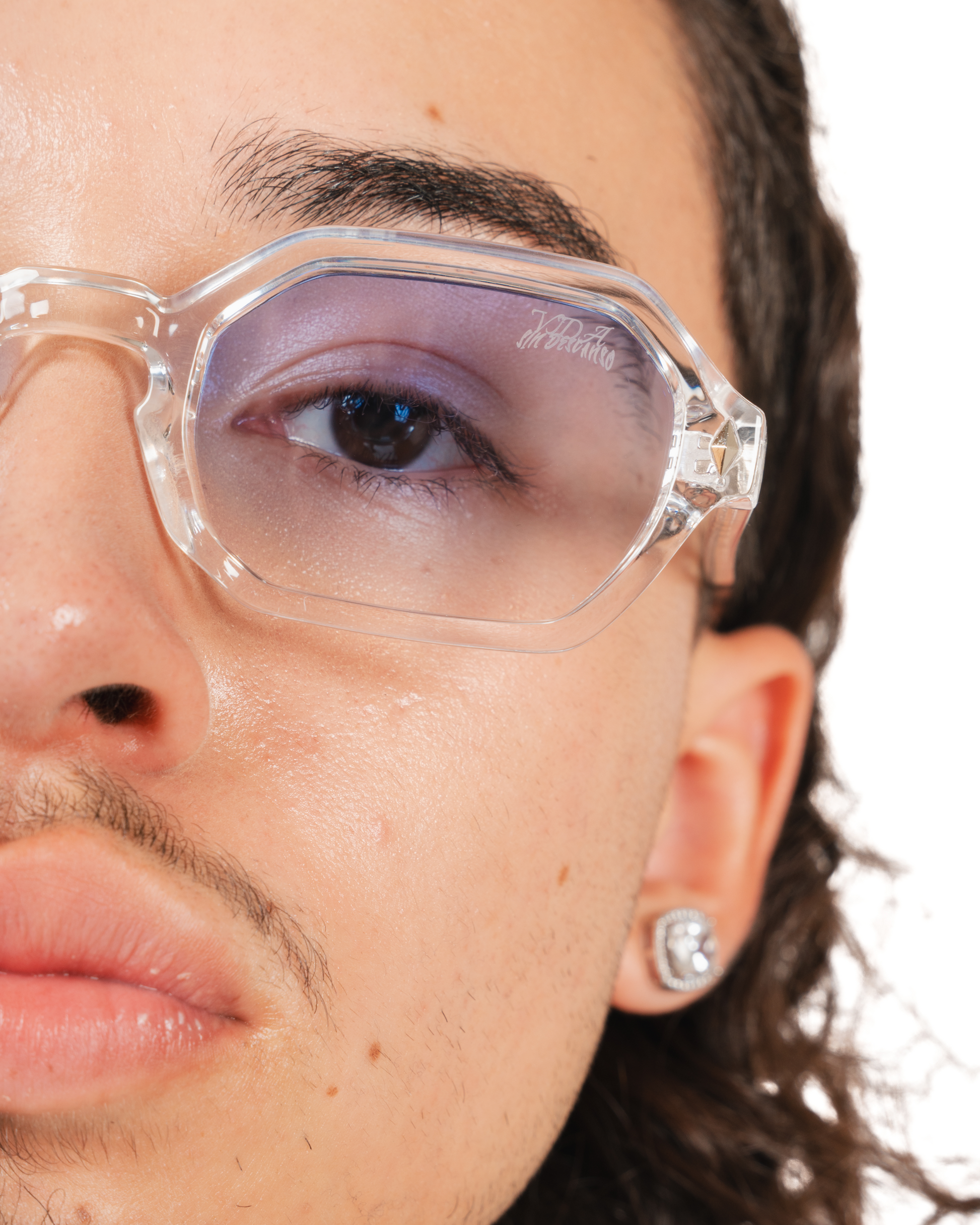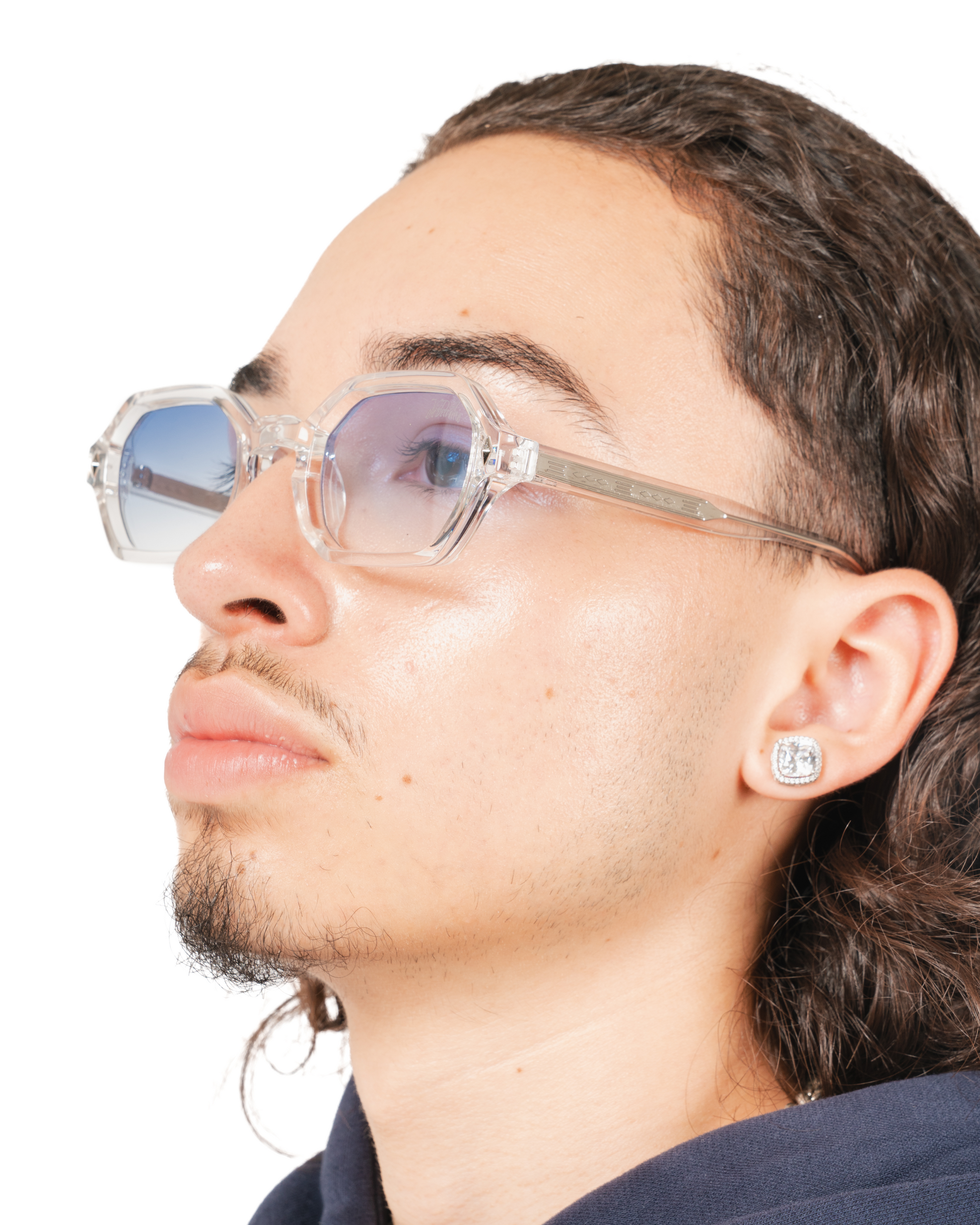 The Lyra B7 Shades feature a transparent frame paired with blue faded lenses, radiating a sense of luxury and modern sophistication. Their unisex design makes them versatile for any occasion, effortlessly complementing both casual and formal looks while providing wearable elegance wherever you go.